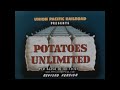 Produced by Vincent H. Hunter and presented by the Union Pacific Railroad, the 1940s short film Potatoes Unlimited provides viewers with a glimpse of the potato industry, from creating potato seed to the transportation to grocery stores via Union Pacific lines. The film begins with several shots of mountain ranges and potato fields, including the area of Idaho just west of the Tetons (